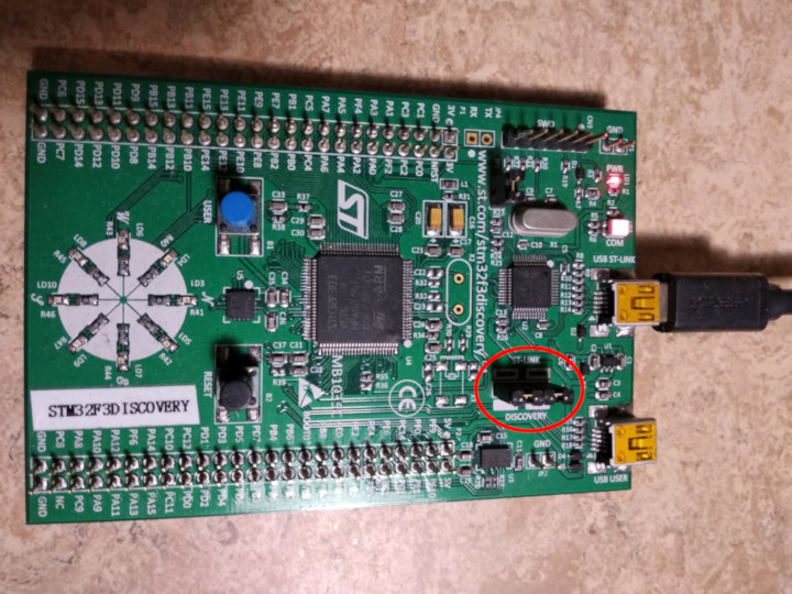Connect your laptop / PC to the discovery board using a micro USB cable. The discovery board has two USB connectors; use the one labeled "USB ST-LINK" that sits on the center of the edge of the board.